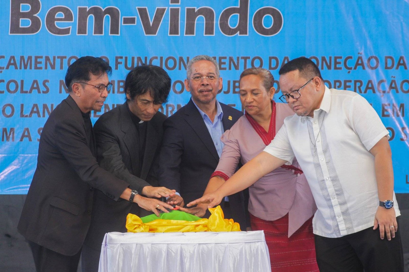 Likisa, 23 Agostu 2025 – Ministru Transporte no Komunikasaun, Eng. Miguel Marques Gonçalves Manetelu, akompaña husi Ministra Edukasaun, Dulçe de Jesus, Sekretáriu Estadu Komunikasaun Sosiál, Expedito Dias Ximenes no Diretór Interinu Koléjiu Santo Inácio Loiola, Kasait, Padre Peter Yoshitaka Ura.SJ, Lansa Koneksaun liña internet ba eskola lima iha teritóriu Timor-Leste, no lansamentu Jornál Parede Dijitál,serimonia ne’e halao iha Koléjiu Santo Inácio Loiola, Kasait, Munisípiu Likisa.
